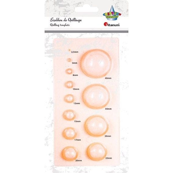 Szablon do tworzenia trójwymiarowych kompozycji techniką quillingu. Wykonany z plastiku, z 12 okrągłymi foremkami o średnicy od 2,5 do 40 mm. Ułatwia zwijanie pasków i ich utrzymanie w utworzonym wzorze podczas schnięcia sklejonych elementów.