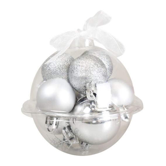 Zestaw srebrnych bombek to klasyka świątecznych ozdób. Umieszczone w przezroczystej kuli z ozdobną wstążką prezentują się efektownie zarówno jako dekoracja samej choinki, jak i w formie prezentu.