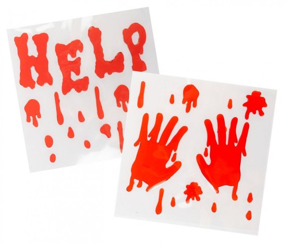 Wzory prezentują zakrwawione ręce lub napis HELP pisany krwią. Takie dekoracje na halloween przyciągają uwagę i budzą strach. Mogą posłużyć jako okienne dekoracje zarówno w domu jak i w samochodzie.