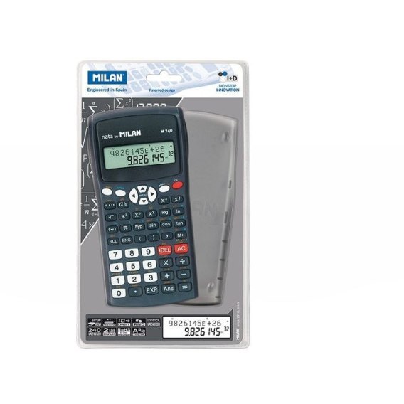 Kalkulator naukowy z 2 liniowym wyświetlaczem LCD (10 + 2 cyfry). Równoczesne wyświetlanie wyrażenia matematycznego i wyniku. Posiada 240 zintegrowanych funkcji. Czarny kalkulator z wytrzymałym pokrowcem ochronnym. Zasilanie: 2 x baterie AAA w zestawie. Zawiera instrukcje. Kalkulatory MILAN spełniają wymagania dyrektywy RoHS o ograniczeniach stosowania niektórych substancji niebezpiecznych w urządzenia elektrycznych i elektronicznych. Oryginalny projekt stworzony przez własny dział badawczo-rozwojowy MILAN. Pakowany na blistrze. Rozmiar kalkulatora: 16,7 x 8,4 x 1,9 cm. Najważniejsze dostępn funkcje: obliczenia statystyczne; rachunek 6 różnych radzajów regresji wraz z ich współczynnikami A,B; wzajemna transformacja współrzędnych prostokątnych i biegunowych; bezpośrednie operacje na ułamkach, także sześćdziesiątkowych; funkcje trygonometryczne i odwrotne do trygonometrycznych; funkcje paraboliczne i hiperboliczne oraz im odwrotne; obliczenia z zastosowaniem jednostek kątowych w stopniach, radianach, gradach; konwersja między systemem dziesiętnym i sześćdziesiętnym; generowanie wartości losowych; obliczanie kombinacji i permutacji; notacja inżynierska; kursor do zmiany MENU; statystyka dwuwymiarowa z obliczaniem wartości średniej, szacowanej i sum; funkcje SCI/FIX/ENG.
