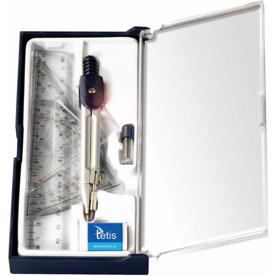 Komplet zawiera: cyrkiel, 2 ekierki, linijkę, kątomierz, gumkę ołówkową oraz zapasowe grafity /2 sztuki/.