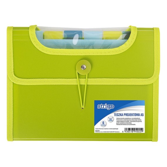 Teczki projektowe VFILE wykonane są z polipropylenu obszytego taśmą, zapewniającą trwałość produktu. Posiadają przezroczystą klapę zamykaną na gumkę i guzik, co zapewnia komfort użytkowania. Kolorowe przekładki ułatwiają zachować porządek w dokumentach. Rozmiar A5, ilość przekładek: 6, występuje w kolorach: czarny, zielony, różowy i fioletowy.