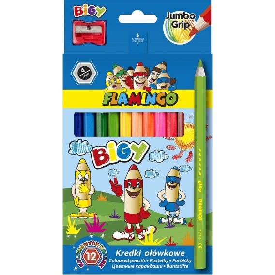 Kredki ołówkowe Bigy Flamingo 12 kolorów sześciokątne Jumbo z temperówką