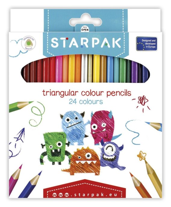 Zalety produktu: Zestaw 24 kredek trójkątnych o wysokiej jakości rysików zapewnia łatwość rysowania i dokładne pokrycie malowanej powierzchni. Nie łamią się podczas strugania. Zapakowane w kartonowe pudełko, które ułatwia przechowywanie. Cechy produktu: najbardziej podstawowe przybory plastyczne w przedszkolu i szkole. Kredki łatwe w struganiu, nie łamią się, nie brudzą, pakowane w pudełko z systemem easy open dzięki, któremu można je łatwo otworzyć i potem zamknąć, kredki ołówkowe to kredki wykonane z kolorowanego węgla drzewnego grafit w drewnianej osłonce. Opis: Kredki to najbardziej podstawowe przybory plastyczne. Wykorzystywane podczas zabawy i nauki w domu, w przedszkolu i szkole. Wszystkie kredki STARPAK mają żywe kolory. Dzięki czemu tworzone prace będą zachwycały intensywnością i nasyceniem barw. Kredki Starpak są łatwe w struganiu i nie łamią się, co jest bardzo ważne, szczególnie dla młodszych dzieci. STARPAK oferuje dwa rodzaje kredek: woskowe, zwane też świecowymi i ołówkowe. Kredki ołówkowe STARPAK są wykonane z kolorowanego węgla drzewnego grafitu w drewnianej osłonce. Dzięki tym kredkom można precyzyjnie rysować kształty i kontury oraz kolorować. Zmieniając nacisk można uzyskać bardziej lub mniej intensywny kolor. 22 modele kredek ołówkowych zaspokoi potrzeby każdego artysty. Wszystkie kredki są pakowane w pudełko z systemem Easy Open dzięki któremu można łatwo, bez rozrywania je otworzyć i potem zamknąć. Wymiary opakowania wys. x szer. x gł. cm 21x17x1. Waga opakowania kg. 0,14 kg. Przeznaczone dla dzieci w wieku 3 .
