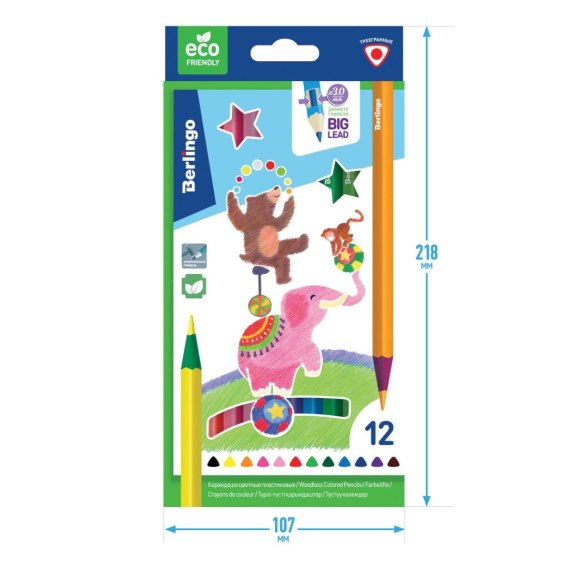 Opakowanie zawiera zestaw trójkątnych, plastikowych kredek Berlingo serii Circus. Kredki „SuperSoft” to linia zupełnie nowych kredek Berlingo stworzona przy udziale unikalnych formuł i technologii obróbki grafitu. Zapewnia zarówno niesamowitą miękkość pisania, jak i trwałość, dzięki czemu kredka wytrzymuje nawet silny nacisk pod kątem 45 stopni. Rysowanie jest lekkie, łatwe i przyjemne.