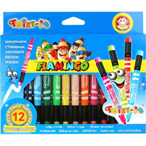 Kredki świecowe Twist-it Flamingo 12 kolorów wykręcane z gumką do wymazywania