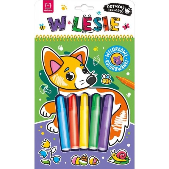 „Dotykaj i koloruj. W lesie" to kolorowanka sensoryczna z dołączonymi pisakami. Tło obrazków pokrywa czarny welur, który podkreśla głębię kolorów, zapewnia wrażenia sensoryczne i ogranicza wychodzenie poza linię. Małych fanów i fanki zwierząt czeka spotkanie z mieszkańcami lasu. W gronie leśnych zwierząt w książce znajdują się: borsuk, dzik i sowa, bobry, niedźwiedź, jeleń, wilk i nietoperze, wiewiórki, zajączek. Dzieci nie tylko pokolorują 8 uroczych rysunków. Przeczytają również wierszyki o zwierzętach z ilustracji. A dzięki perforacji pokolorowaną pracę mogą oderwać, włożyć do ramki i podarować w prezencie lub ozdobić nią pokój.