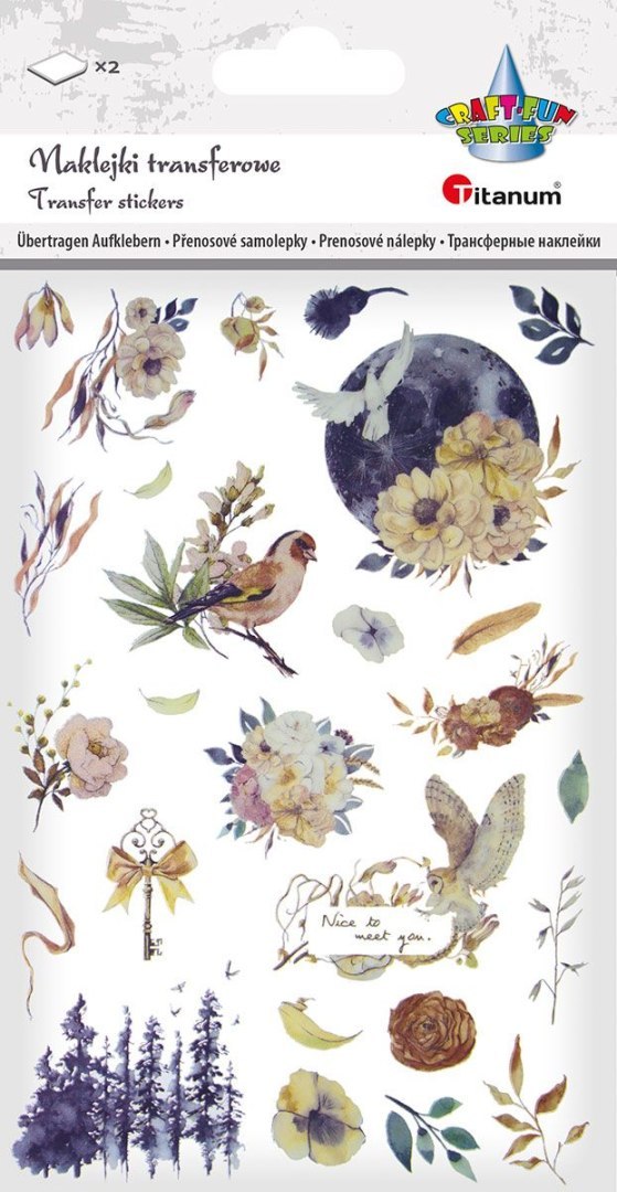 Naklejki transferowe, wzór: księżyc, las, ptak, koło zębate, bukiety. 2 plansze. Instrukcja: wytnij element, który chcesz użyć, usuń tylną, przezroczystą folię, przyklej element do powierzchni, dociśnij go - a następnie potrzyj, usuń przednią, przezroczystą folię.