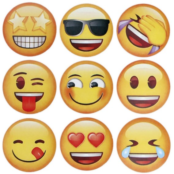Naklejki papierowe na taśmie, 9 wzorów emotikony, średnica 25 mm, żółte. 500 sztuk.
