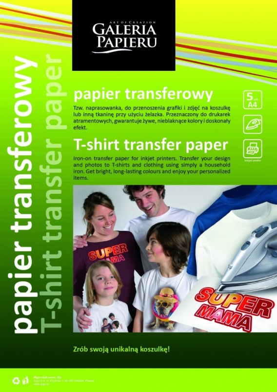 Papier transferowy, format: A4, gramatura: 140 g/m2, ilość: 5 arkuszy w opakowaniu, do tkanin bawełnianych w ciemnych kolorach, do drukarek atramentowych, umożliwia przeniesienie dowolnej grafiki i zdjęć za pomocą żelazka na tkaniny bawełniane,