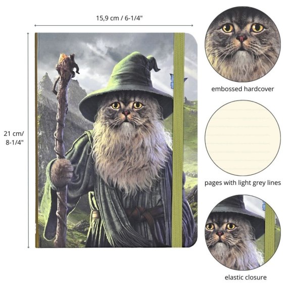 Każdy notes marki Peter Pauper Press jest wyjątkowym dziełem sztuki. Bogactwo motywów i kolorów sprawia, że każdy znajdzie wzór idealnie dopasowany do osoby i okazji. Okładka w stylistyce fantasy przedstawia kota w kapeluszu. Notatnik posiada błyszczące elementy, tłoczenia oraz dopasowane kolorystycznie zamknięcie na gumkę.
