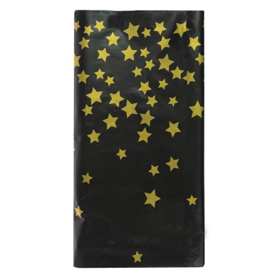 Uniwersalny czarny obrus w gwiazdki, idealny na różnego rodzaju imprezy, w tym sylwestra, bal karnawałowy. Wykonany z materiału PEVA, zapewnia elegancki wygląd i trwałość. Obrus o wymiarach doskonałych do stołu bankietowego, dodaje estetycznego wyglądu aranżacji stołu.