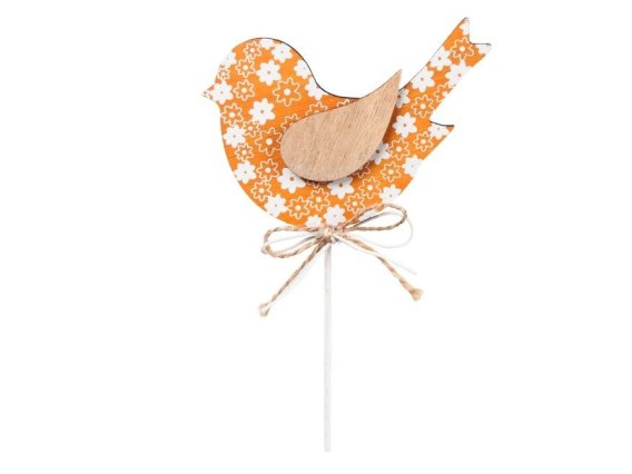 Ptak na piku drewniany 31x11cm pomarańczowy Drewniany ptak na piku. Można nim doskonale udekorować wielkanocne pudełka lub kwiaty w wazonie. Kolor: pomarańczowy z naturalnymi skrzydłami Materiał: sklejka Długość całkowita: 310 mm Cena za 1 szt. Waga: 0.01 kg adres producenta: MFP paper s.r.o.