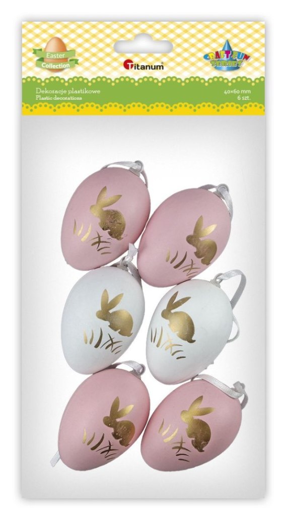 Zawieszki plastikowe, wzór: jajka, wymiary: 40 x 60 mm, kolory: białe i różowe ze złotym nadrukiem króliczka i trawy. 6 sztuk.