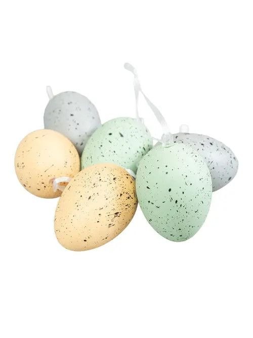 Dekoracyjne jajka z zawieszką to stylowa ozdoba wielkanocna, która doskonale wpisuje się w naturalne i wiosenne aranżacje wnętrz. Delikatna, matowa powierzchnia z subtelnym nakrapianym wzorem nadaje jajkom rustykalny i elegancki charakter. Stonowana, pastelowa kolorystyka harmonijnie komponuje się z innymi dekoracjami wielkanocnymi, podkreślając lekkość i świeżość wystroju. Praktyczne zawieszki umożliwiają łatwe eksponowanie jajek na gałązkach, stroikach lub w kompozycjach dekoracyjnych.