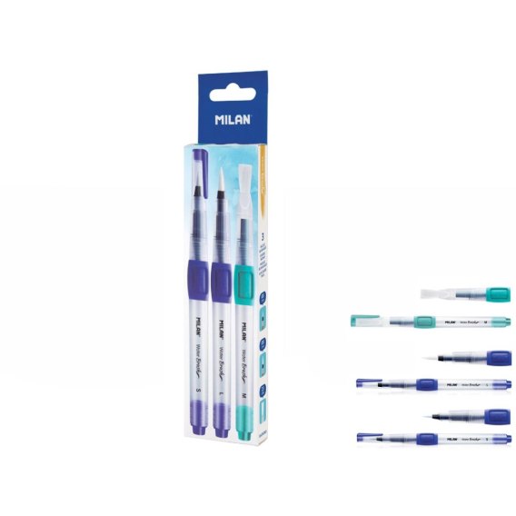 Pędzle z wymiennym zbiornikiem na wodę o pojemności 8 ml. Nadaje się do prac akwarelowych kredkami, rysowania rozmytego lub tuszu i mycia. Nylonowe włosy syntetyczne. Zawiera dwie okrągłe szczotki o średnicy 3 mm (mała) i 5 mm (duża) oraz jedną płaską szczotkę o szerokości 7,5 mm. Z przyciskiem regulacji płynów i hermetycznym kurkiem. Idealny do zabierania w dowolne miejsce i wykonywania szybkich szkiców, łącząc różne rodzaje pociągnięć oferowanych przez pędzle. Może być uzupełniony o okrągłą końcówkę pędzla o średnicy 4 mm (średniej wielkości) dostępny w blistrach: BWM10351 i BWM10401.