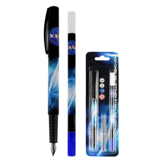 Zalety produktu: Pióro wieczne NASA STARPAK o kształcie dostosowanym do dłoni dziecka, z wytrzymałą stalówką, wykonaną z wysokiej jakości materiału. Specjalnie wyprofilowana, antypoślizgowa strefa uchwytu zapewnia komfort i pomaga w nauce pisania Twojego dziecka. Zapoznaj się również z innymi produktami dedykowanymi biurze i szkole W piórze znajduje się miejsce na zapasowy wkład, dzięki czemu Twojemu dziecku nigdy nie zabraknie atramentu w trakcie pisania. Całość została ozdobiona elegancką grafiką. W zestawie dwa naboje wymienne i dwustronny wymazywacz w pisaku. Końcówka wymazująca oznaczona białą zakrętką skutecznie usuwa błędy, a końcówka korygująca oznaczona niebieską zakrętką pozwala na poprawę błędów. Wymazywacz również został ozdobiony eleganckim nadrukiem, dzięki czemu tworzy komplet z piórem wiecznym. Wykonane z trwałego materiału. Zestaw pakowany na blistrze. Produkt nieodpowiedni dla dzieci poniżej 3 lat. Wymiary produktu pióro 13 cm, wymazywacz 17 cm. Wymiary opakowania wys.x szer. x gł. cm : 23x7x2. Pakowanie karton 40szt.