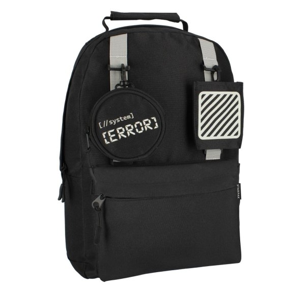 Zalety: plecak składa się z 1 dużej komory, w środku komory znajduję się organizer, posiada z przodu kieszeń zapinaną na zamek, dodatkowe dopinane kieszonki w postaci portfela oraz schowka np. na legitymację szkolną czy chusteczki higieniczne, wytrzymałe zamki błyskawiczne, ergonomiczne szelki, regulowane szelki pozwalają dopasować plecak do wzrostu i budowy ciała, plecak posiada uchwyt pozwalając zawiesić plecak na wieszaku lub wygodnie nosić go w ręce. Plecak o pojemności 22 l. Plecak w czarnej kolorystyce. Wygodny i funkcjonalny plecak szkolny STARPAK z młodzieżową grafiką z serii Error. Użytkowanie takiego plecaka to czysta przyjemność. Zapoznaj się również z innymi produktami STARPAK dedykowanymi młodzieży Wykonany z trwałego materiału. Plecak jest wyrobem tekstylnym. Przeznaczony dla dzieci w wieku: 3 . Wymiary produktu wys. x szer. x gł. cm : 42x30x14, waga produktu kg : 0,41 kg. Plecak pakowany w folię. Pakowanie w kartonie po 12 szt.