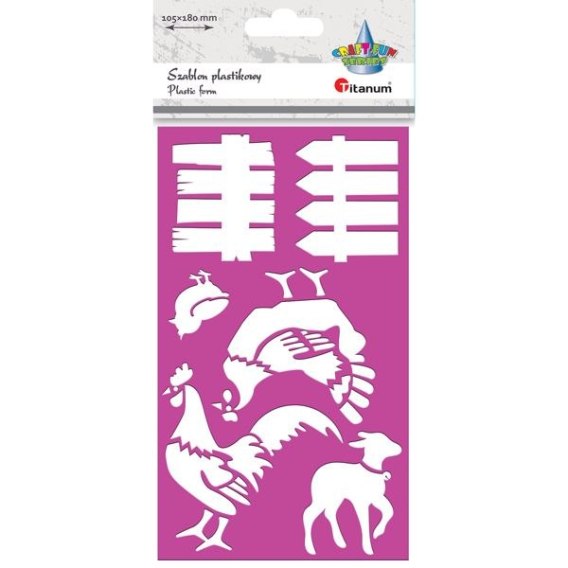 Szablon plastikowy 105 x 180 mm, wzór ZAGRODA (płotki, kogut, kura, kurczak, jagnię).