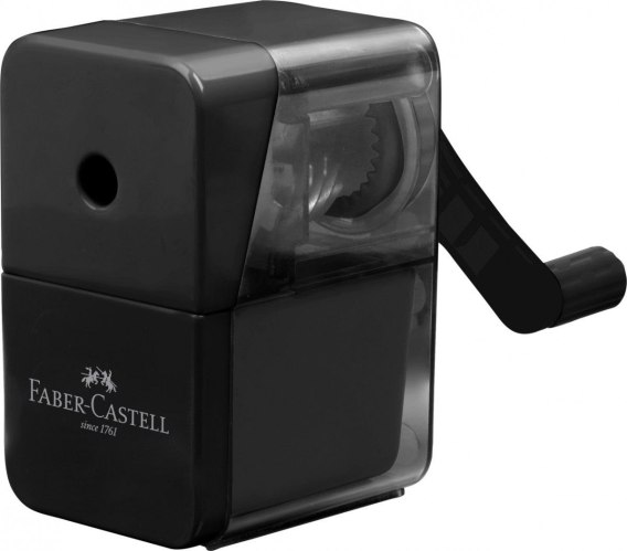 Temperówka na korbkę Faber-Castell w kolorze czarnym z pojemnikiem na ostrużyny. Standardowa stołowa temperówka przeznaczona do klasycznych i trójkątnych kredek i ołówków o średnicy do 8,4 mm. Z mechanizmem na korbkę i wysokiej jakości ostrzem. Nie zawiera PVC.