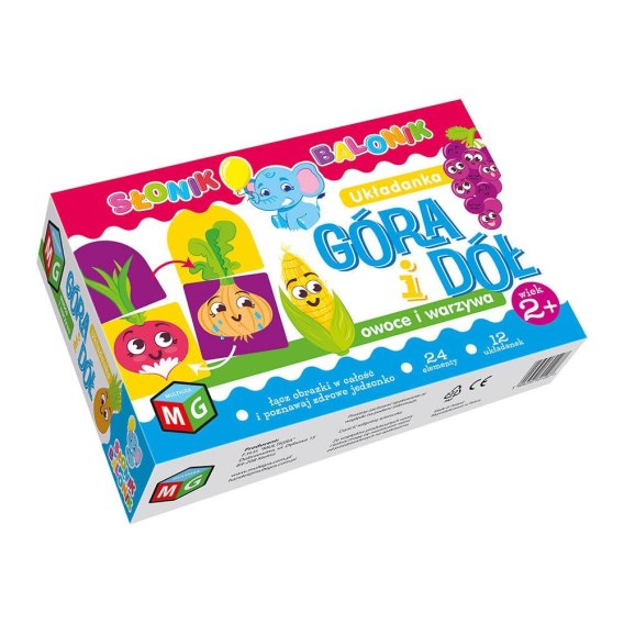 Słonik Balonik wychodzi naprzeciw potrzebom najmłodszych. Dzięki zastosowaniu dużych elementów z wysokiej jakości grubej tektury, dzieci z łatwością je chwytają, ćwicząc małą motorykę. Kolorowe obrazki rozbudzają w maluchach wyobraźnię, a zróżnicowane zadania świetnie wpływają na ich rozwój. "UKŁADANKA GÓRA I DÓŁ: OWOCE I WARZYWA" to przyjemna zabawa dla maluchów i ich rodziców. Układaj uśmiechnięte warzywa, pamiętaj tylko, żeby się nie pomylić! Dopasuj górę marchewki do jej dołu. Ojej! A płacząca cebula? Przecież powinna mieć na głowie szczypiorek, a nie natkę! Proste i miłe dla oka ilustracje nie rozpraszają uwagi dziecka, dzięki czemu zabawa rozwija zdolność kojarzenia, dobierania w pary i spostrzegawczość. Kolorowe tła układanek ułatwiają ułożenie całej ilustracji. Elementy są wykonane z grubej tektury, a dzięki obłym kształtom całość jest przyjazna nawet dla małych dzieci.